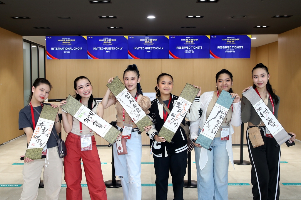 | ▲ 한글 캘리그라피 선물 받은 합창단원들 [강릉 세계합창대회 조직위 제공. 재판매 및 DB 금지] |