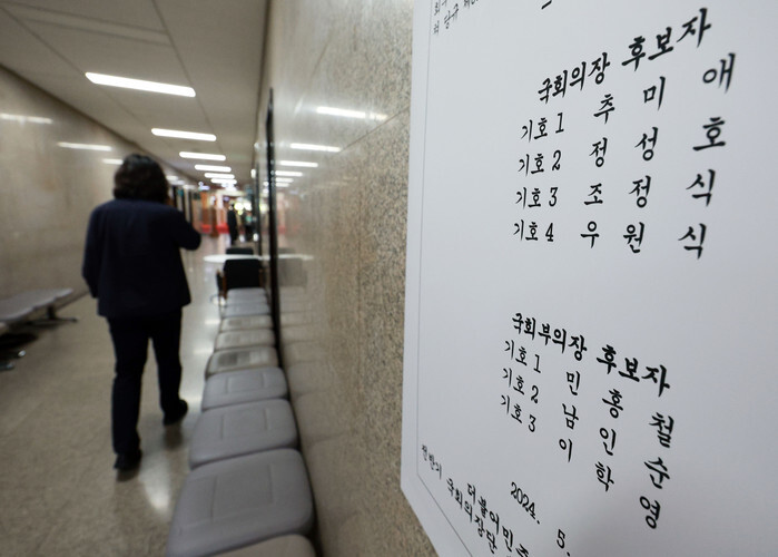 A notice showing candidates of the main opposition Democratic Party (DP) running for positions in the race to elect a new speaker and vice speaker is attached to the wall of the DP chair's office at the National Assembly in Seoul on May 9, 2024. (Yonhap)
