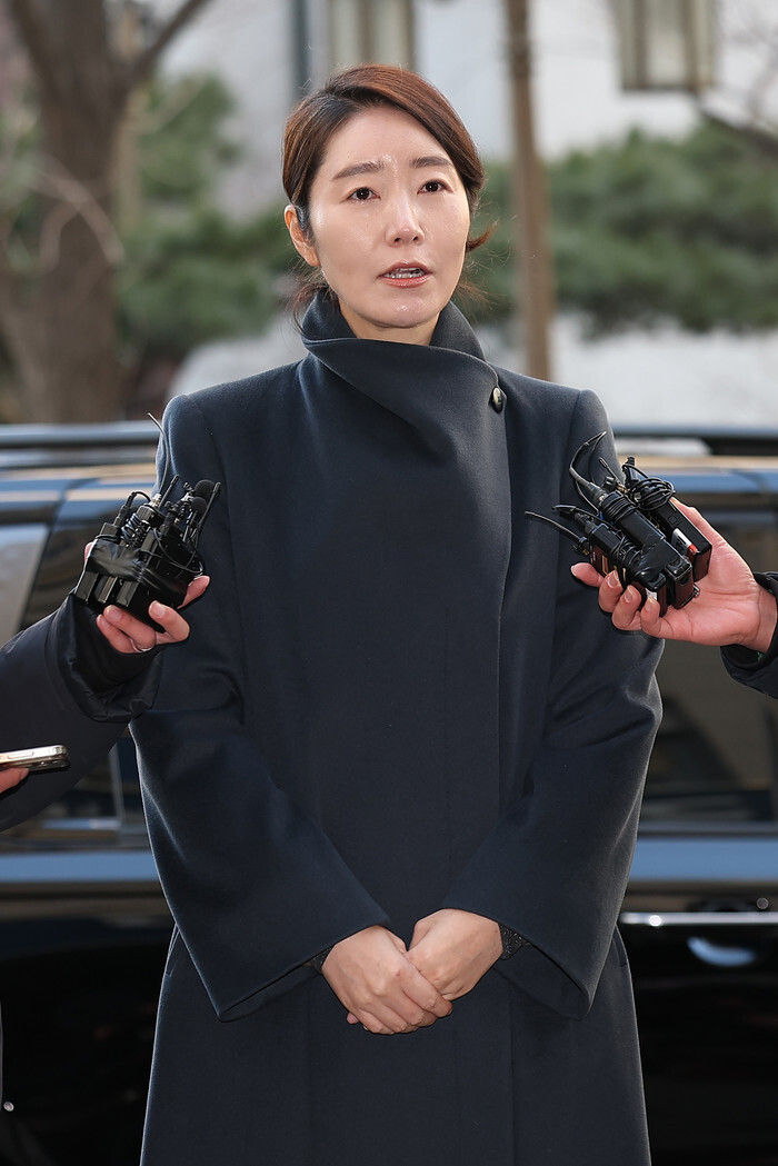 Kang Sun-woo, a former ruling party lawmaker and currently independent, speaks to reporters as she appears at a unit of the Seoul Metropolitan Police Agency in the capital on Jan. 20, 2026, to be questioned over allegedly receiving a bribe from Kim Kyung, a Seoul city councilor, ahead of the local elections in 2022 in exchange for her nomination. (Yonhap)