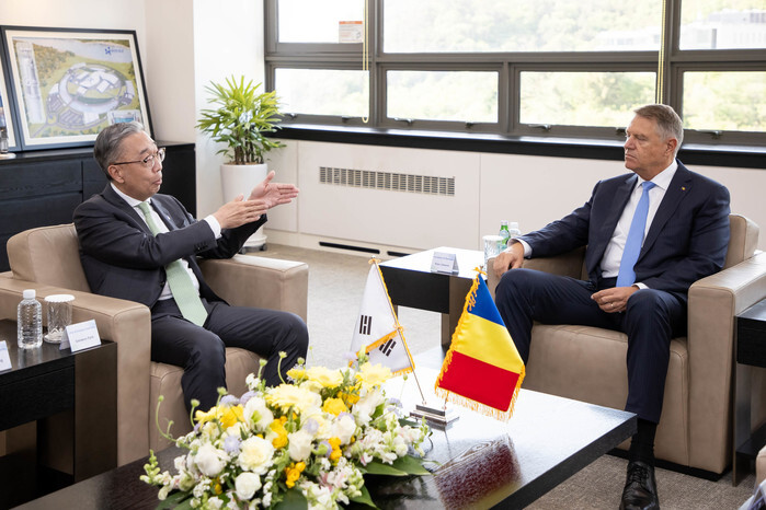 Park Gee-won (L), head of Doosan Enerbility, talks with Romanian President Klaus Iohannis during the latter's visit to the South Korean energy company, which produces small nuclear reactors, in Changwon, some 300 kilometers southeast of Seoul, on April 24, 2024, in this photo provided by the company. (PHOTO NOT FOR SALE) (Yonhap)