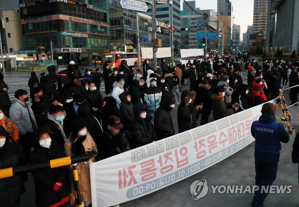 해운대구 관계자와 경찰은 거리두기를 호소하며 통제선 밖 질서 유지에 안간힘을 썼다.