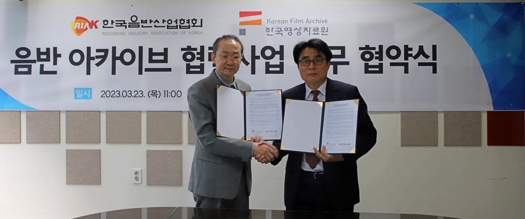 ▲ 한국영상자료원과 한국음반산업협회는 23일 마포구 상암동 음반산업협회 사무실에서 '음반 아카이브 협력사업' 추진을 위한 업무협약(MOU)을 맺었다. 음반산업협회는 영상자료원이 소장한 LP 등 오래된 음반을 디지털 형태로 변환한 뒤 아카이브 작업을 하기로 했다. 아울러 향후 문화체육관광부와의 협의를 통해 사업 규모를 확대해 나갈 예정이다. (서울=연합뉴스)