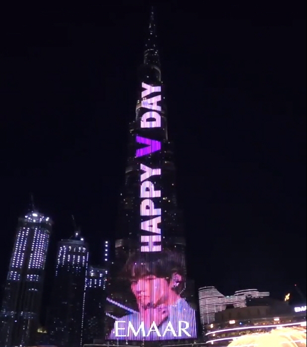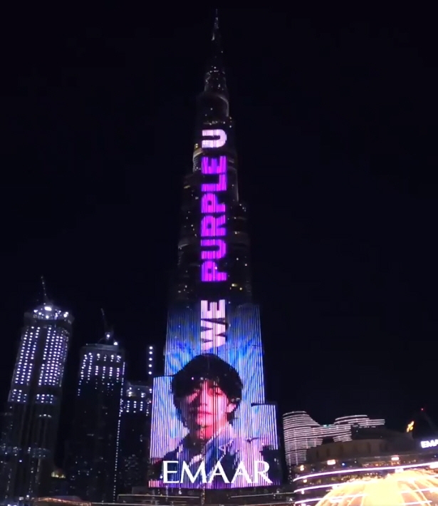 'HAPPY V DAY', 'KIM TAEHYUNG'(뷔 본명), 'BTS V', 'WE PURPLE U' 등 축하 메시지와 뷔의 사진 등이 163층, 828m 높이의 건물 외벽 전체를 뒤덮었다.