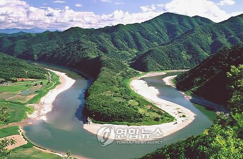 좌우가 바뀐 모양의 한반도 지형은 굽이굽이 흐르는 금강 줄기가 만들어 낸 절경인데, 한반도를 980분의 1로 축소한 형태이다.