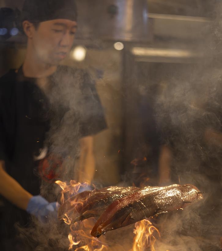 개점과 동시에 가쓰오를 짚불에 굽는 '불 쇼'가 펼쳐진다.