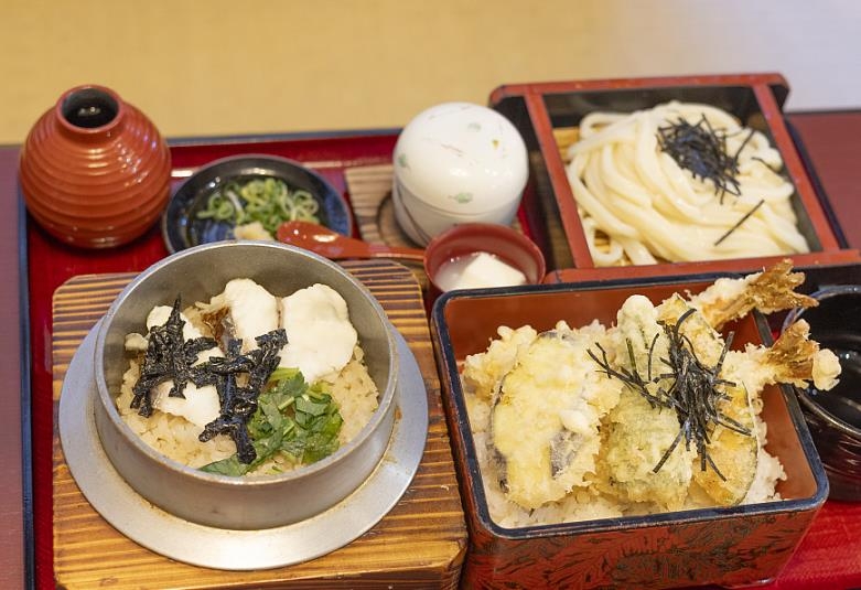세트 메뉴로는 우동 또는 각종 야채와 새우 등의 튀김이 함께 나오는 경우가 많다.