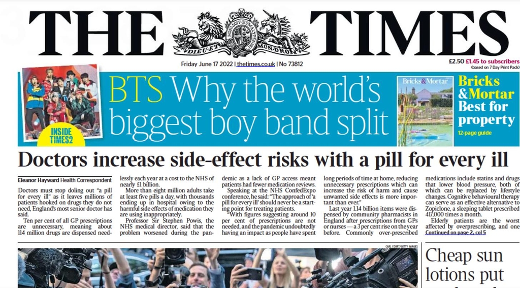 (런던=연합뉴스) 최윤정 특파원 = 영국 유력 일간 더 타임스가 17일(현지시간)자 지면 3개면을 할애해서 방탄소년단(BTS)의 활동 잠정 중단과 관련한 특집 기사를 실었다.
