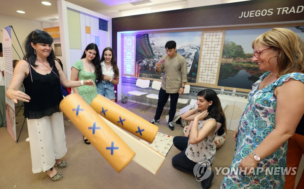 | ▲ 윷놀이 체험하는 스페인 현지인들 (서울=연합뉴스) 9일 스페인 마드리드의 넵튜노 궁전에서 열린 한국 문화관광 종합행사에서 현지인들이 윷놀이를 체험하고 있다. 2022.7.10 [문화체육관광부 제공. 재판매 및 DB 금지] photo@yna.co.kr |