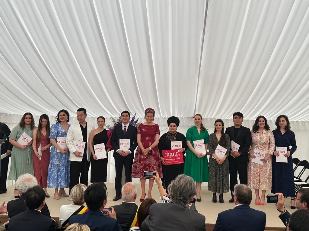 | ▲ 벨기에 마틸드 왕비와 기념사진 촬영하는 김태한 (워털루[벨기에]=연합뉴스) 정빛나 특파원 = 지난 4일(현지시간) 벨기에 '퀸 엘리자베스 콩쿠르'에서 우승한 바리톤 김태한(22)이 6일 벨기에 브뤼셀 인근 워털루에서 열린 공식 시상식에서 상장을 들고 벨기에 마틸드 왕비(오른쪽 두번째)와 기념사진을 촬영하고 있다. 2023.6.6 shine@yna.co.kr [재판매 및 DB 금지] |