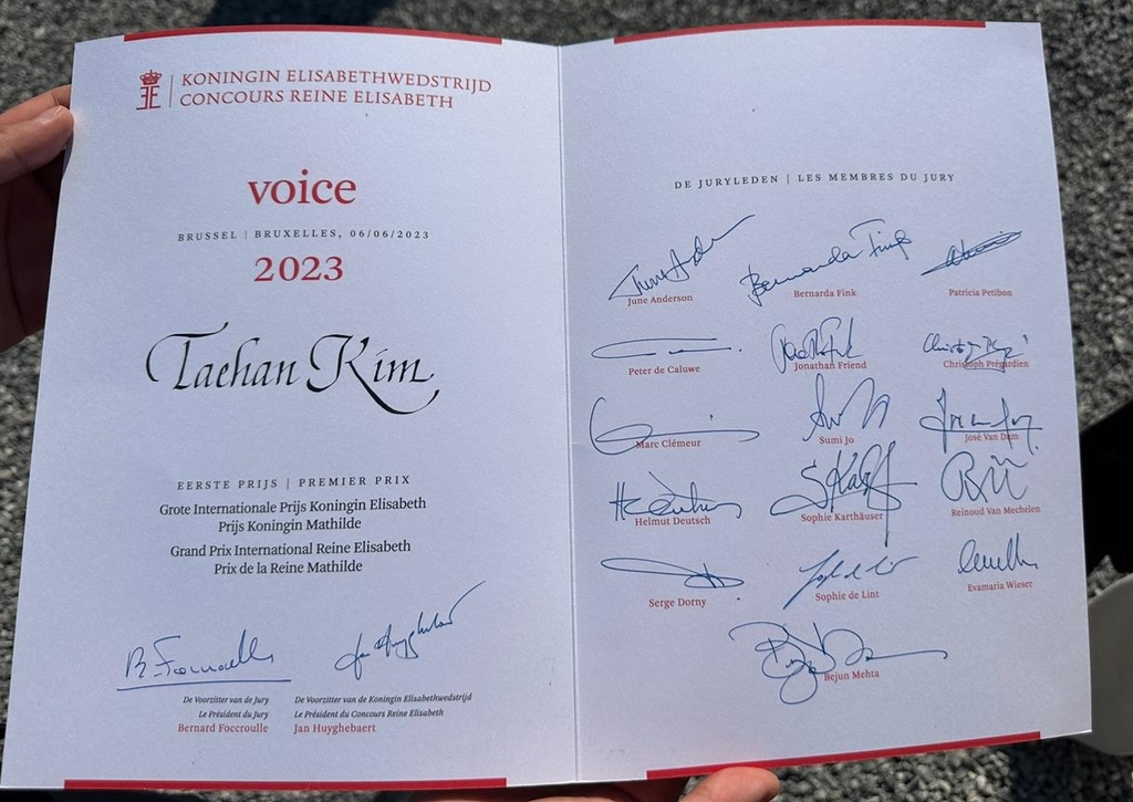 | ▲ 퀸엘리자베스 콩쿠르 시상식 참석한 김태한 (워털루[벨기에]=연합뉴스) 정빛나 특파원 = 지난 4일(현지시간) 벨기에 '퀸 엘리자베스 콩쿠르'에서 우승한 바리톤 김태한(22)이 6일 벨기에 브뤼셀 인근 워털루에서 열린 공식 시상식에서 상장을 들고 기념사진을 촬영하고 있다. 2023.6.6 shine@yna.co.kr [재판매 및 DB 금지] |