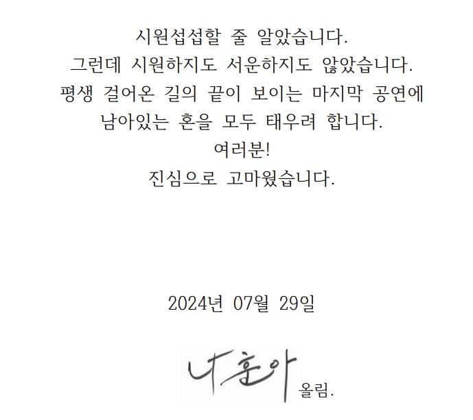 나훈아는 29일 소속사를 통해 공개한 편지에서 "평생 걸어온 길의 끝이 보이는 마지막 공연에 남아있는 혼을 모두 태우려 한다"고 적었다.