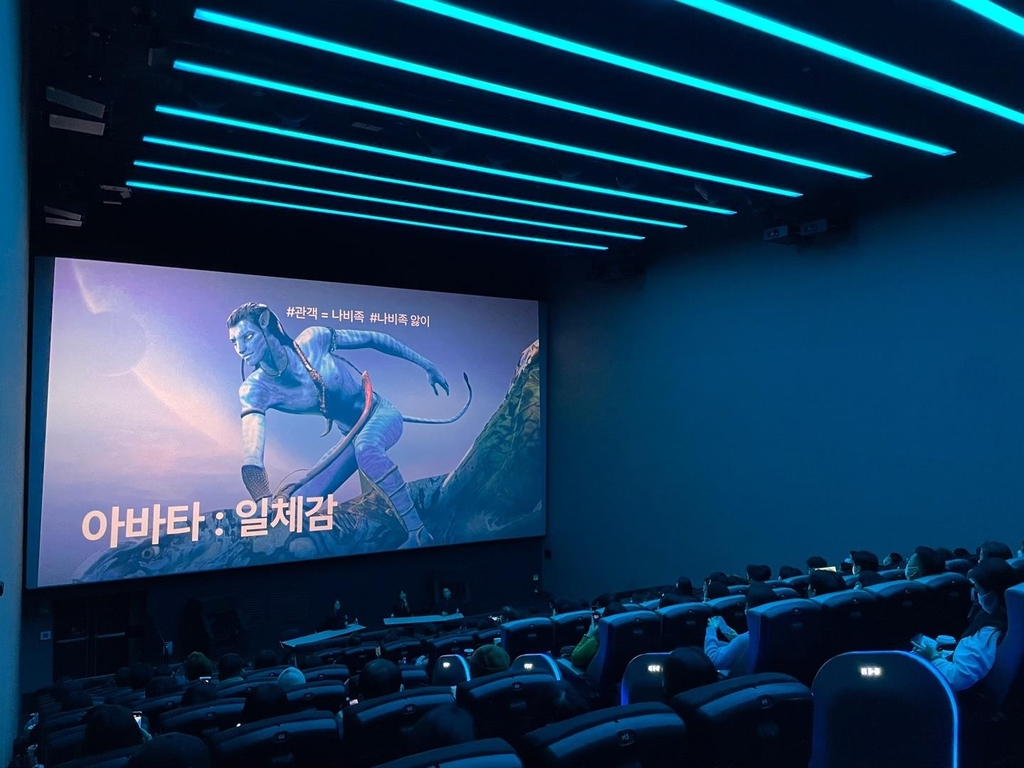 | ▲ '아바타2' 3D에 4DX·스크린X까지 (서울=연합뉴스) 할리우드 대작 '아바타:물의 길'(아바타2)이 지난 14일 개봉했다. 이날 서울 용산아이파크몰에서는 언론사 기자 등을 대상으로 '아바타2' 3D 버전을 4DX·스크린X 기능이 있는 특별관에서 시범 상영하는 이벤트가 열렸다. 2022.12.15 [CGV제공. 재배포 및 DB금지] |