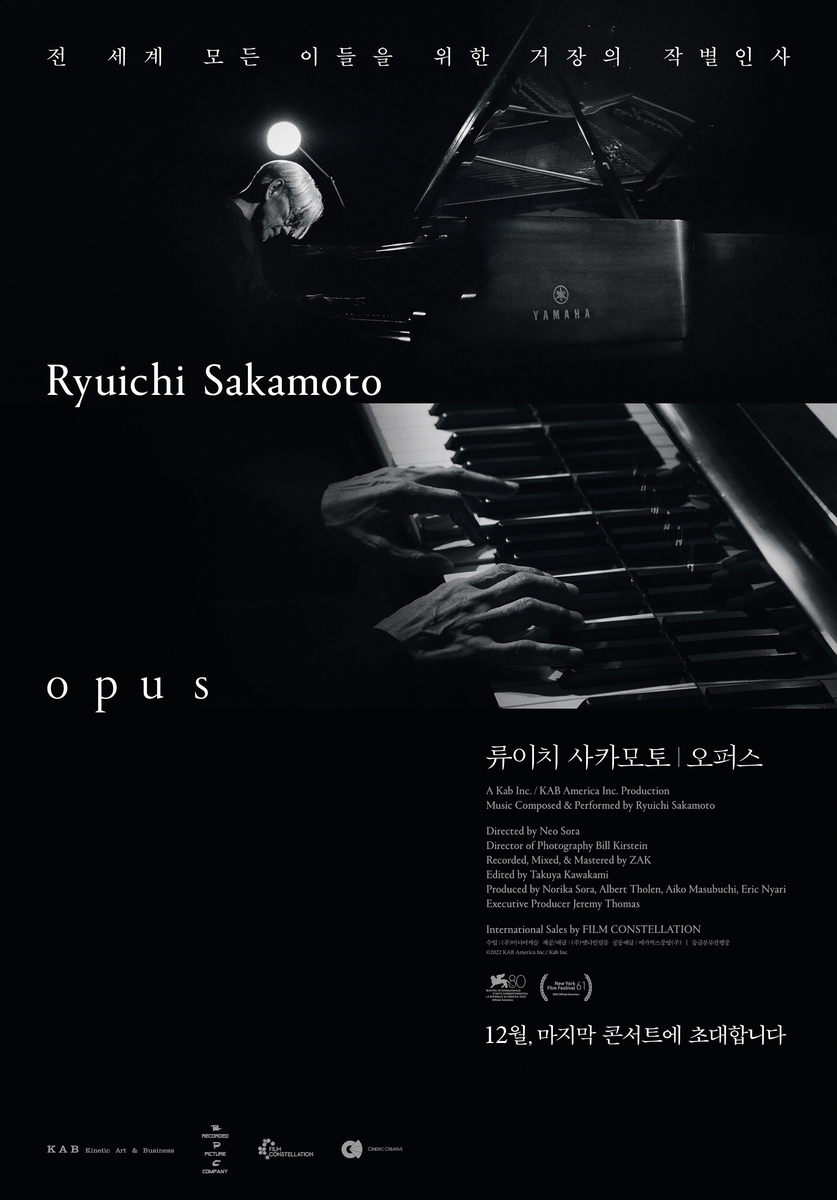 (서울=연합뉴스) 오보람 기자 = 고(故) 사카모토 류이치의 마지막 연주를 담은 콘서트 영화 '류이치 사카모토: 오퍼스'가 다음 달 27일 한국에서 전 세계 최초 개봉한다고 수입사 미디어캐슬이 28일 밝혔다.