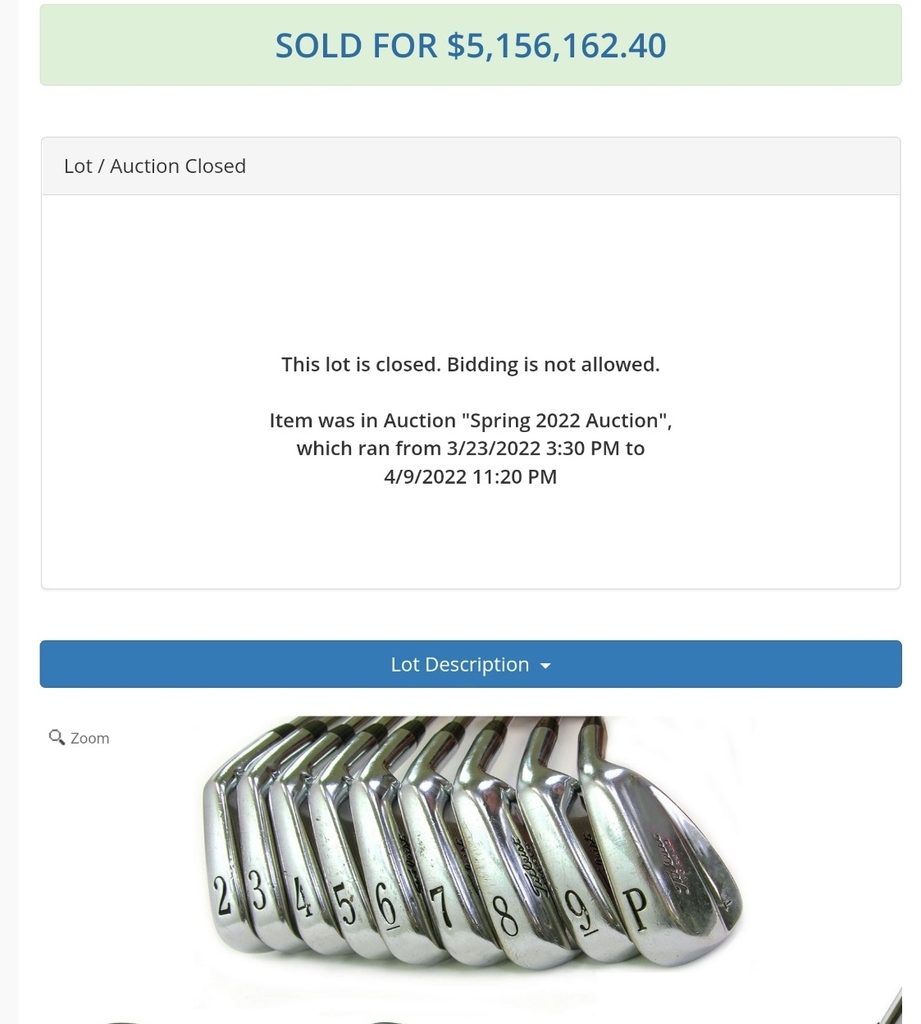 브록은 2010년 타이틀리스트 부회장이었던 스티브 마타가 경매에 내놓은 이 아이언 세트를 5만7천242 달러에 샀다가 이번에 100배 가까운 금액에 되팔았다.