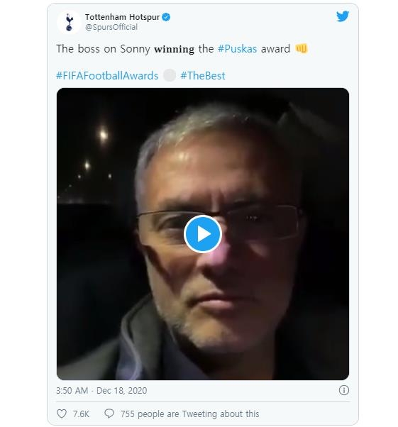 모리뉴 감독은 구단 SNS에 실린 영상에서 "집으로 가는 중이고 FIFA TV로 시상식을 보고 있다"며 "손흥민이 시즌 최고의 골에 주는 푸슈카시상을 받았다. 당연히 쏘니다!"라고 말했다.