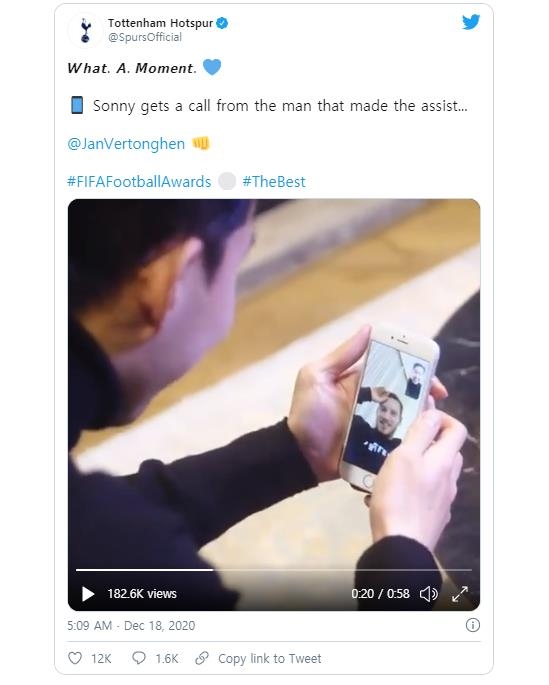 토트넘은 SNS에 손흥민과 얀 페르통언(벤피카)의 영상 통화 모습도 공개했다.
