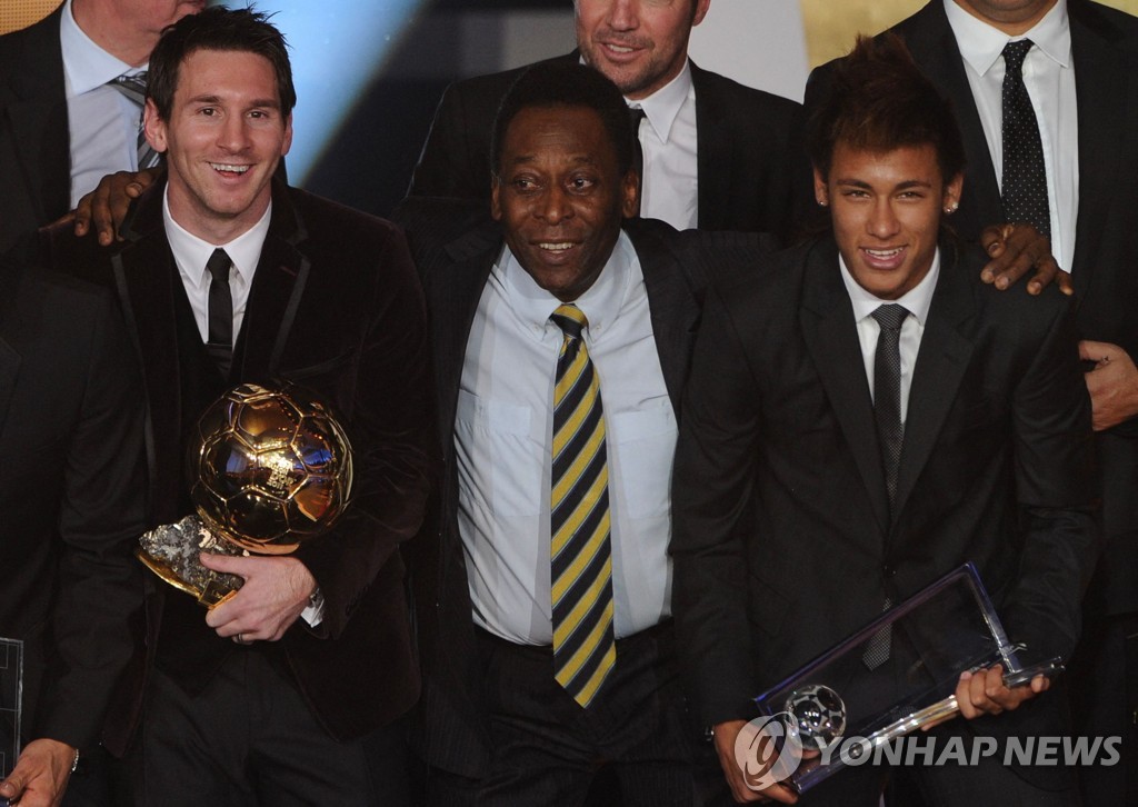 | ▲ 2012년 발롱도르 시상식 때 메시, 펠레, 네이마르의 모습 [AFP=연합뉴스 자료사진] |