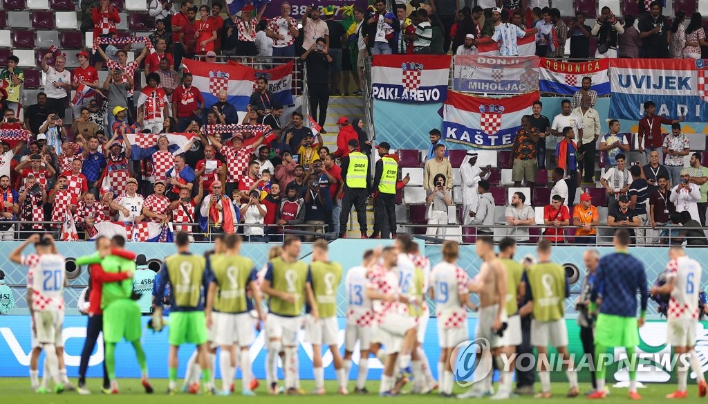 | ▲ 기뻐하는 크로아티아 관중 (도하=연합뉴스) 김도훈 기자 = 27일(현지시간) 카타르 도하의 칼리파 인터내셔널 스타디움에서 열린 2022 카타르 월드컵 조별리그 F조 크로아티아와 캐나다의 경기가 4-1 크로아티아의 역전승으로 끝나자 크로아티아 응원팬들이 환호하고 있다. 2022.11.28 superdoo82@yna.co.kr |