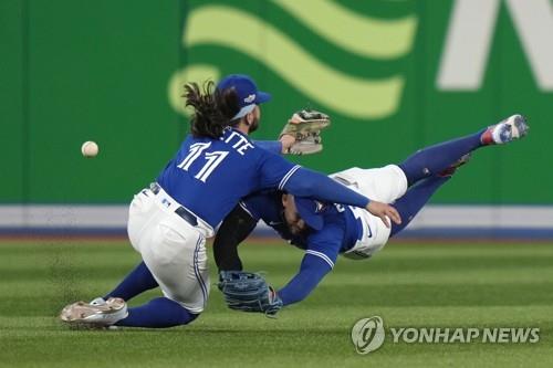 | ▲ 8회초 2사 만루에서 크로퍼드의 타구를 놓쳐 3타점 2루타를 허용한 토론토 수비진. [AP=연합뉴스] |