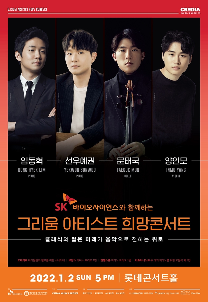 공연기획사 크레디아는 SK케미칼이 젊은 클래식 아티스트를 후원하는 프로젝트 '그리움 아티스트' 역대 수상자인 임동혁·선우예권·문태국·양인모가 내년 1월 2일 오후 5시 서울 송파구 롯데콘서트홀에서 '그리움 아티스트 희망콘서트'를 연다고 7일 밝혔다.