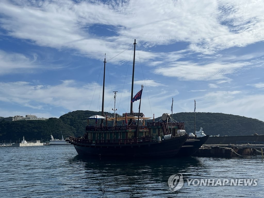 ▲ 이즈하라항에 정박 중인 조선통신사선 재현선 3일 일본 쓰시마(對馬·대마도) 이즈하라(嚴原)항에 정박 중인 조선통신사선 재현선 모습. [국립해양문화재연구소 제공. 재판매 및 DB 금지]