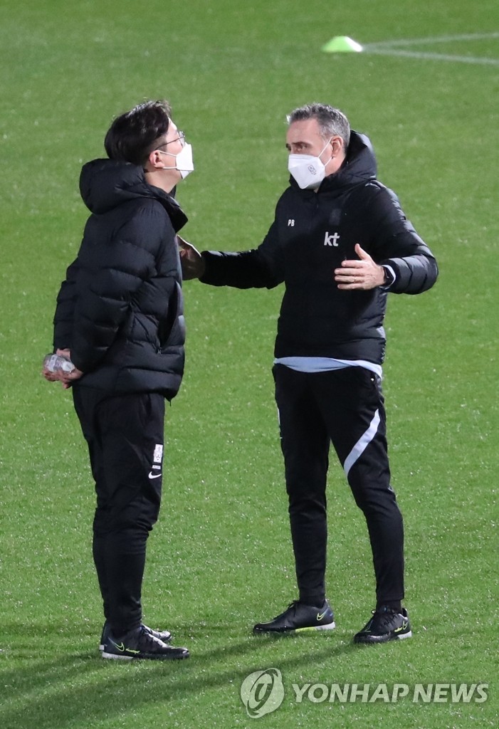| ▲ Paulo Bento (R), head coach of the South Korean men's national football team, chats with a team official at a stadium in Yokohama during practice on March 22, 2021. (Yonhap) |