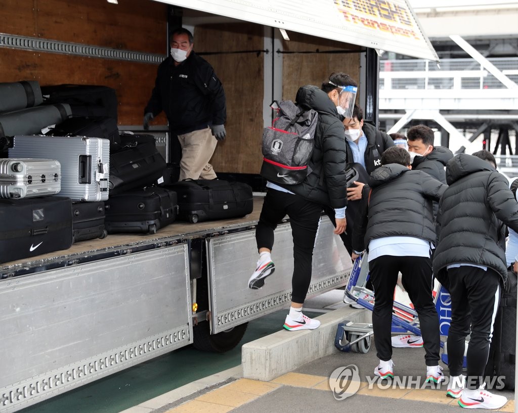 | ▲ Members of the South Korean men's national football team load their bags onto a truck at Narita International Airport in Chiba, Japan, on March 22, 2021, after making the trip for a friendly match against Japan. (Yonhap) |