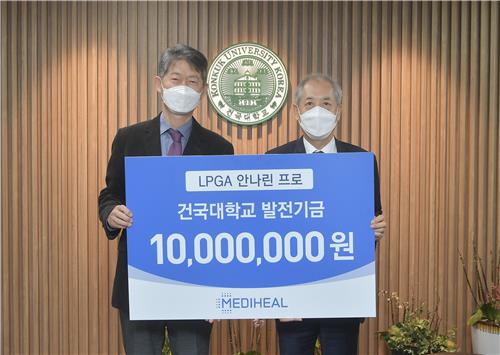 건국대는 "안나린이 후원사인 메디힐 골프단과 함께 건국발전기금 1천만원을 기부했다"고 14일 밝혔다.
