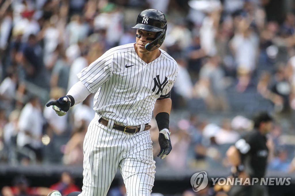 (서울=연합뉴스) 김경윤 기자 = 자유계약선수(FA) 자격 취득을 앞두고 맹활약 중인 에런 저지(30·뉴욕 양키스)가 최근 3연속 홈런, 시즌 54호 홈런을 날리며 양키스 우타자 역대 최다 홈런 타이기록을 썼다.