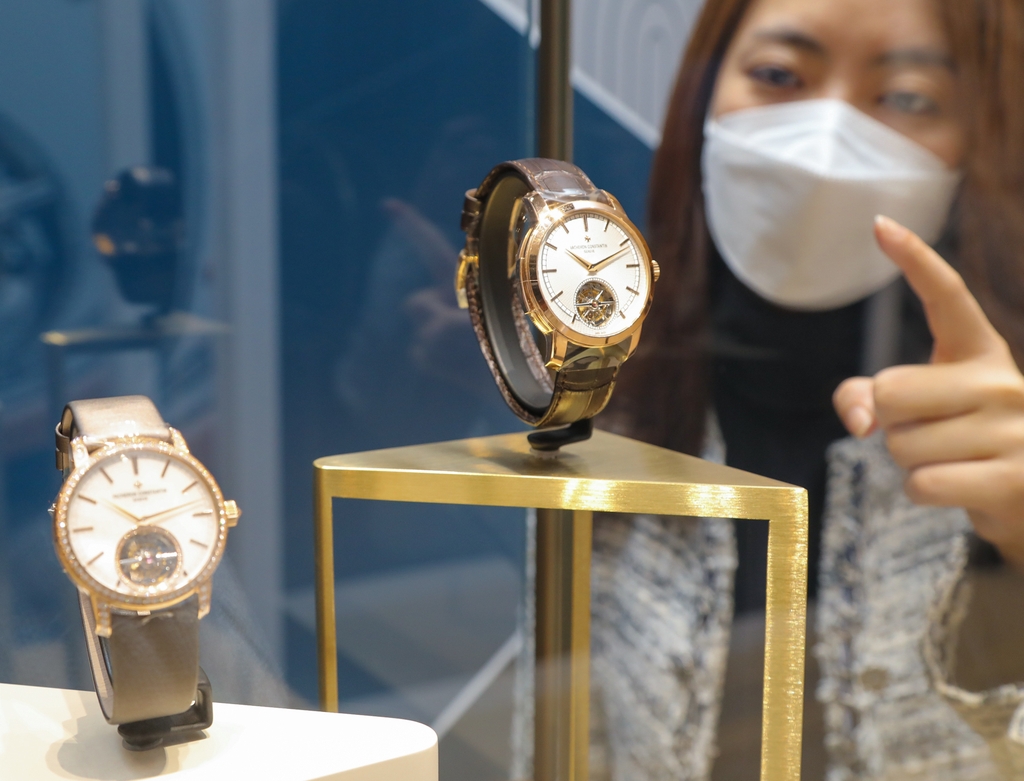 | ▲ 시계·주얼리 페어 현대백화점 더현대 서울 1층에 위치한 스위스 명품 시계 브랜드 '바쉐론 콘스탄틴' 팝업스토어에서 직원이 '트래디셔널 미닛 리피터 트루비용', '트래디셔널 트루비용'을 소개하고 있는 모습. [현대백화점 제공. 재판매 및 DB 금지] |