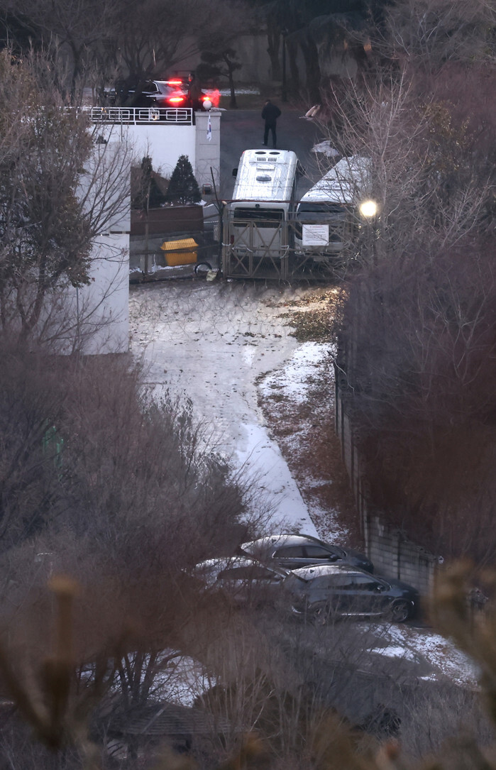 Vehicles block a road leading to the entrance of impeached President Yoon Suk Yeol's official residence in Seoul on Jan. 10, 2025, as investigators led by the Corruption Investigation Office for High-ranking Officials are expected to execute a second warrant to detain Yoon in connection with his short-lived imposition of martial law. (Yonhap)