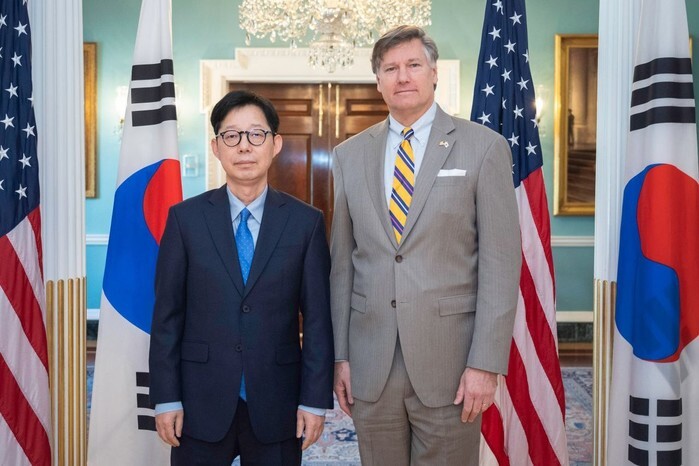 South Korea's First Vice Foreign Minister Park Yoon-joo (L) and U.S. Deputy Secretary of State Christopher Landau pose for a photo during their meeting at the State Department in Washington on Dec. 1, 2025, in this photo released by the South Korean foreign ministry. (PHOTO NOT FOR SALE) (Yonhap)