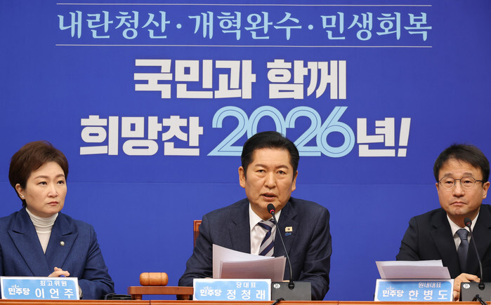 Jung Chung-rae (C), leader of the ruling Democratic Party, attends a meeting of its Supreme Council at the National Assembly in Seoul on Jan. 19, 2026. (Yonhap)
