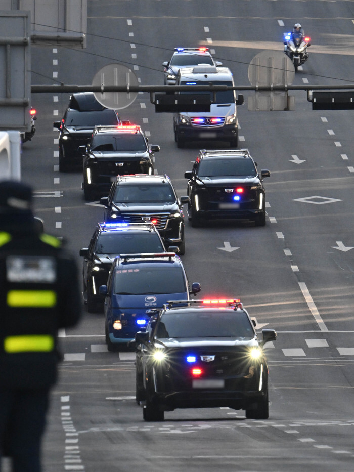 A Ministry of Justice vehicle (blue, 2nd from bottom) carrying arrested President Yoon Suk Yeol drives en route to the Seoul Central District Court in the capital on Feb. 20, 2025, as Yoon will attend the first hearing of his criminal trial on insurrection charges in connection with his short-lived imposition of martial law in December. (Yonhap)