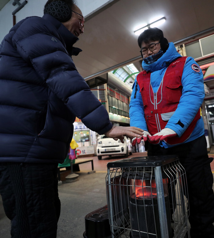 Shopkeepers warm themselves over an electric heater at a traditional market in Jecheon, North Chungcheong Province, central South Korea, on Dec. 4, 2025, as a spell of cold weather hits South Korea, with the mercury dropping to a low of minus 10 C in the region. (Yonhap)