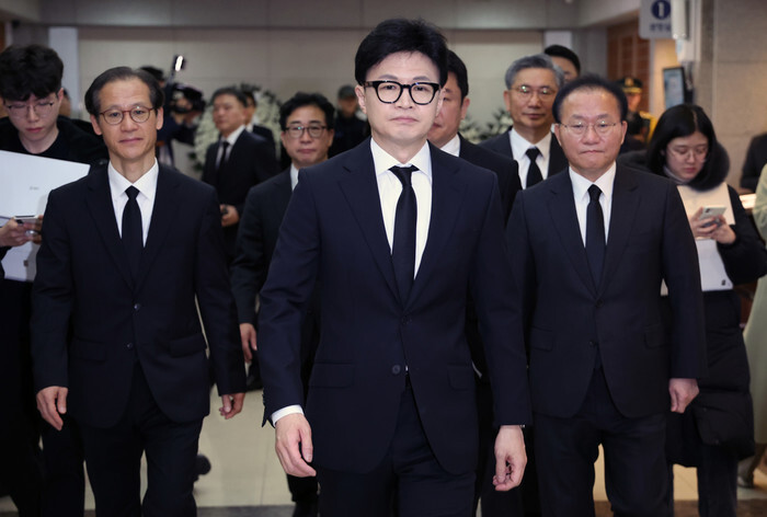 Han Dong-hoon (C), chief of the ruling People Power Party, visits the memorial altar for Son Myung-soon, spouse of the late former President Kim Young-sam, at Seoul National University in the capital on March 8, 2024. The former first lady died at the age of 95 the previous day. (Yonhap)
