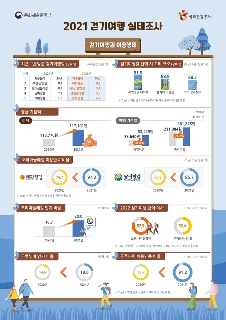 한국관광공사는 지난해 12월 10~30일 만 15세 이상 국민 4천명을 대상으로 온라인 및 가구방문 면접조사를 통해 진행한 '2021 걷기여행 실태조사' 결과를 19일 발표했다.