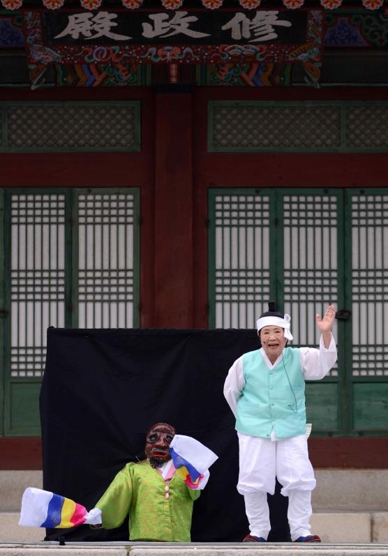 조영숙 국가무형문화재 발탈 보유자가 29일 서울 강남구 국가무형문화재전수교육관 민속극장 풍류에서 무대에 올라 흥겨운 노래와 익살스러운 재담을 선사한다.
