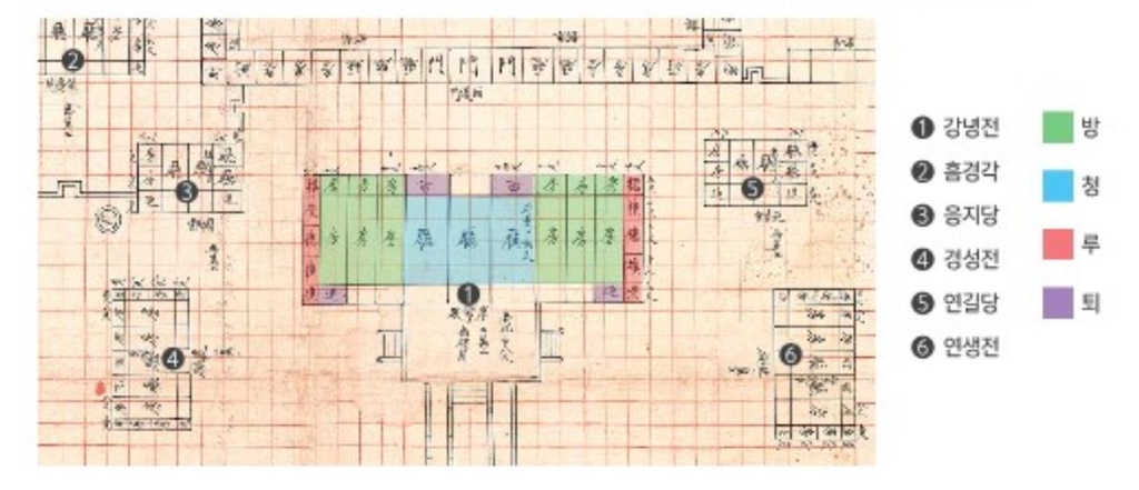 예컨대 왕과 왕비의 침전으로 사용된 강녕전의 침실에는 '방'을 표기했고, 마루에는 '청', 툇마루에 '퇴', 다락 또는 단이 높게 구성된 실에는 '누'라고 표기했다.
