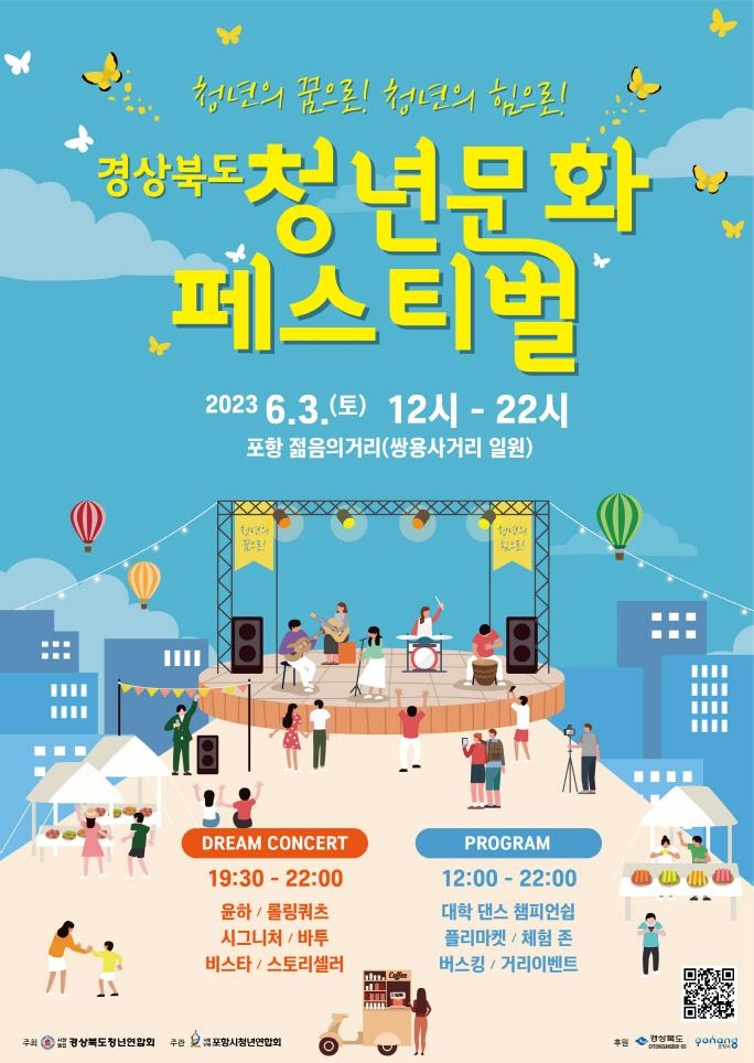 (포항=연합뉴스) 손대성 기자 = 경북청년연합회와 포항시청년연합회는 다음달 3일 포항 상대동 '젊음의 거리' 일원에서 '경상북도 청년문화 페스티벌'을 개최한다고 30일 밝혔다.