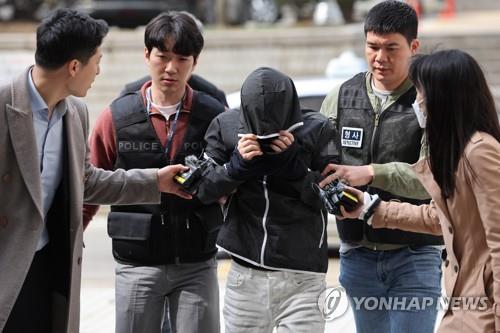 | ▲ A man surnamed Yoo (C), suspected of being the mastermind behind a recent kidnapping and murder of a woman, is taken to the Seoul Central District Court on April 7, 2023, for a hearing to review the police's request for a warrant to arrest him. (Yonhap) |