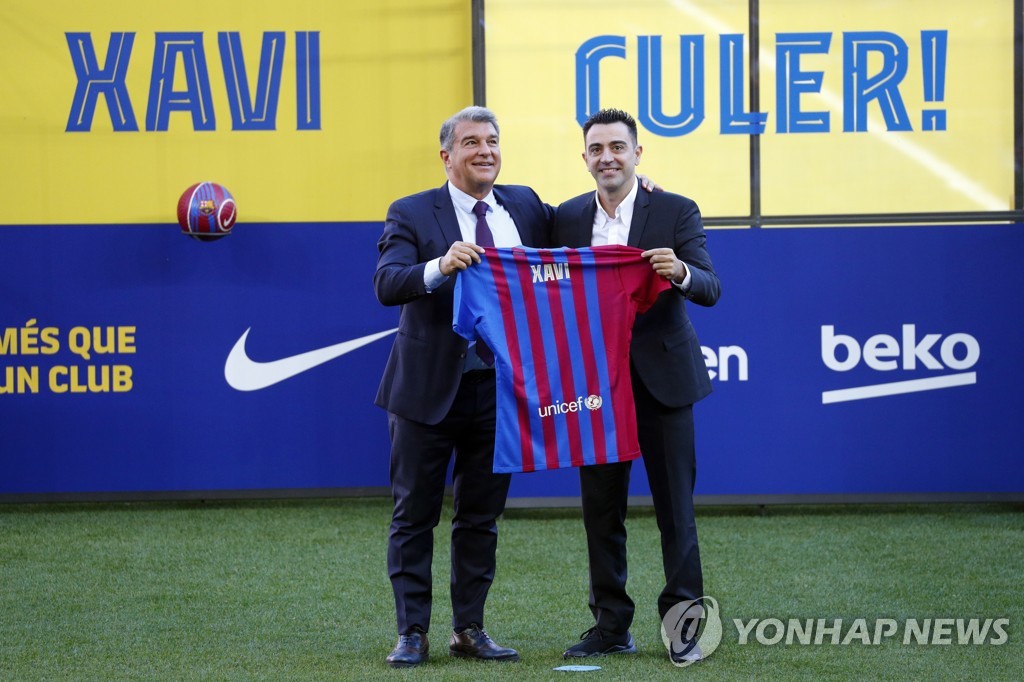 | ▲ 바르셀로나의 신임 사령탑 사비(오른쪽)와 후안 라포르타 회장. [EPA=연합뉴스] |