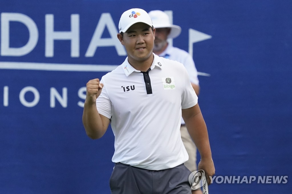 | ▲ 윈덤 챔피언십 우승 김주형…'PGA 1호 2000년대생 우승자' (그린즈버러 AP=연합뉴스) 김주형(20)이 7일(현지시간) 미국 노스캐롤라이나주 그린즈버러 세지필드 컨트리클럽에서 열린 미국프로골프(PGA) 투어 윈덤 챔피언십에서 우승한 뒤 손을 불끈 쥐고 있다. 2위권에 5타 앞선20언더파 260타로 우승한 그는 2000년대생으로는 처음으로 PGA 투어에서 우승한 선수가 됐다. 2022.8.8 alo95@yna.co.kr |