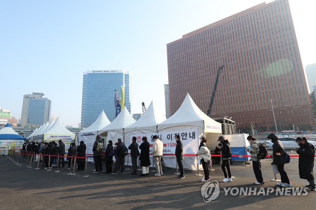| ▲ People wait in line to take COVID-19 tests at a makeshift testing center in front of Seoul Station in central Seoul on Feb. 12, 2022. (Yonhap) |
