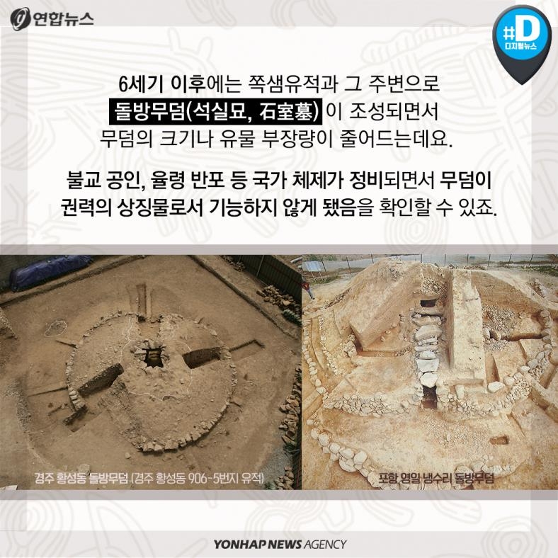 6세기 이후에는 쪽샘유적과 그 주변으로 돌방무덤(석실묘, 石室墓)이 조성되면서 무덤의 크기나 유물 부장량이 줄어드는데요.