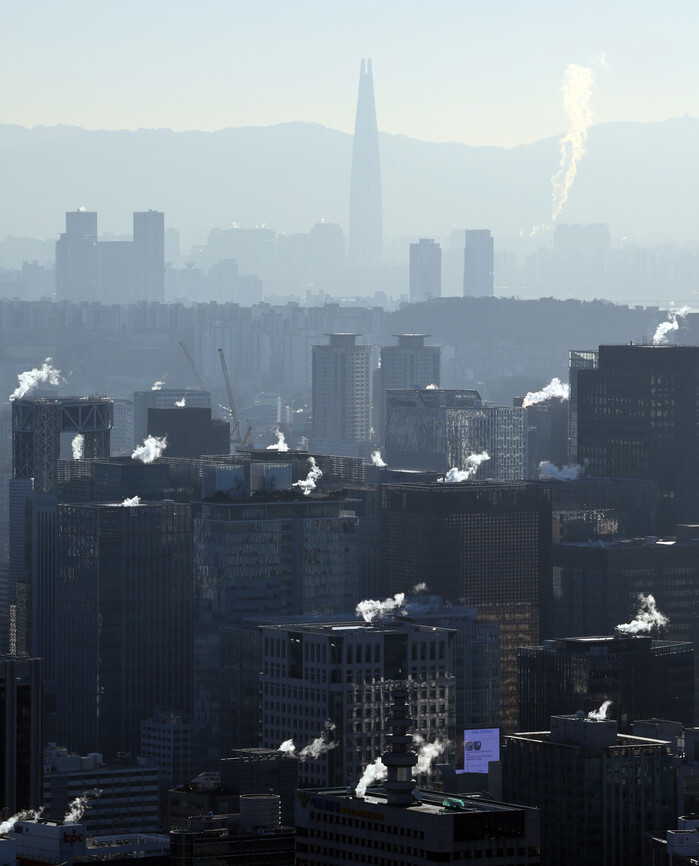 Buildings vent steam generated from heating in downtown Seoul on Dec. 4, 2025, as South Korea experienced cold weather, with the mercury dropping to an intraday low of minus 9 C in the South Korean capital. (Yonhap)