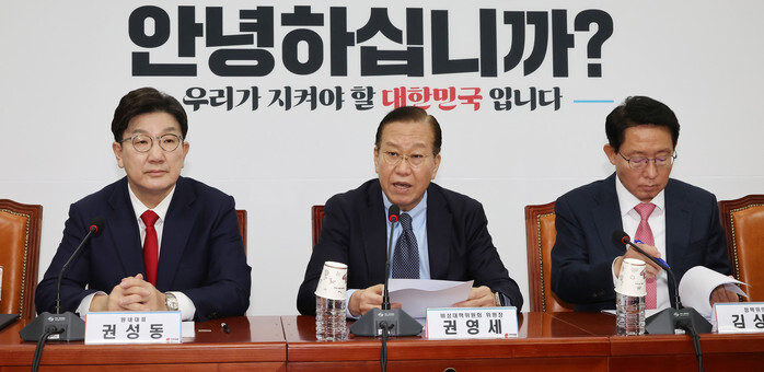 Kwon Young-se (C), chief of the ruling People Power Party's emergency leadership committee, speaks during a meeting of the committee at the National Assembly in Seoul on March 10, 2025. (Yonhap)