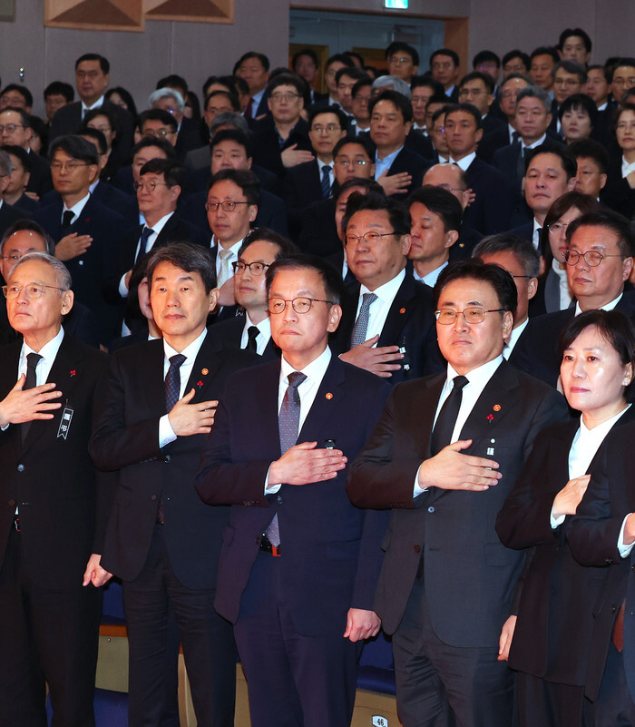 Acting President Choi Sang-mok (C, front) salutes the national flag during a ceremony to mark the start of business for the new year at the government complex in Seoul on Jan. 2, 2025. (Pool photo) (Yonhap)
