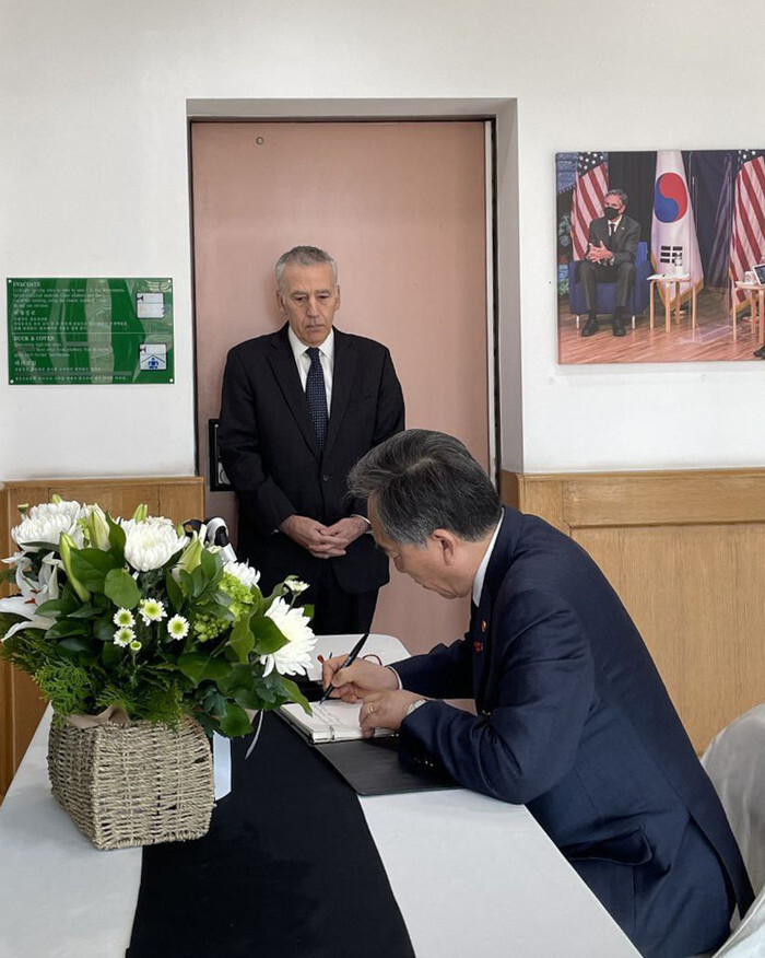 South Korean Foreign Minister Cho Tae-yul signs a condolence book for late former U.S. President Jimmy Carter, with U.S. Ambassador to South Korea Philip Goldberg looking on, at the U.S. Embassy in Seoul on Jan. 2, 2025, in this photo released by the foreign ministry. (PHOTO NOT FOR SALE) (Yonhap)