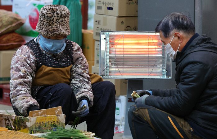 Shopkeepers trim scallions while warming themselves with an electric heater at an agricultural wholesale market in Incheon, west of Seoul, as South Korea is hit by cold weather, with the mercury falling to a low of 1 C in the region. (Yonhap)